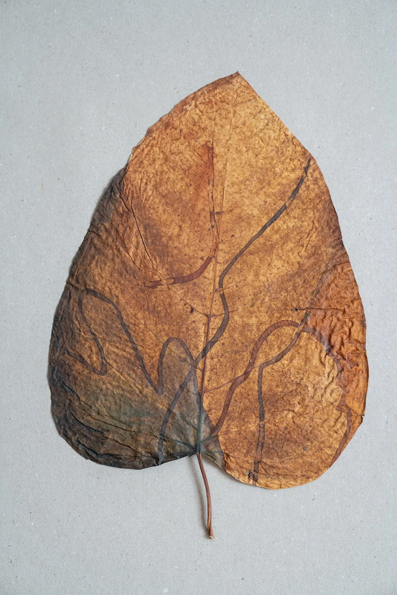 On an outing in the Berlin countryside, I came across a trumpet tree with enormous, beautiful leaves. The freshly fallen leaves captivated me instantly, and I couldn’t help but think about nature’s constant transformation: from the freshness of spring to the vibrant life of summer and the stunning color palette of autumn. It seemed as if the leaves were trying to capture all the attention one last time before finally falling from the branch.
